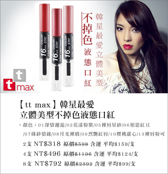 | tt max-韓星最愛立體美型不掉色液態口紅-最低一支$99完美呈現韓妞水潤雙唇!九色任選,塗抹簡單方便,妝感持久不掉色,打造動人姿態!平均每支最低只要99元起(含運)即可購得【tt max】韓星最愛 售價:99